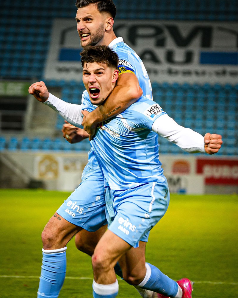 Nur wenige Minuten später schickt Pistol mit einem schnell ausgeführten Einwurf wieder Grimaldi in die Spur. Der nimmt den Ball noch in der eigenen Hälfte an, schnelle Drehung und los geht’s. Er lässt mit Ball drei Gegenspieler stehen, zieht in den Strafraum und versenkt die Kugel zur 2:1 Führung! Großer Jubel in Himmelblau, und ziemlich konsternierte Gäste. Kurz darauf hätte es sogar noch besser werden können, aber Bozic verpasste eine Eingabe von Grimaldi knapp. Wer so einen Verlauf zur Pause prophezeit hätte, wäre ausgelacht worden.